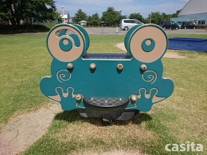 大型遊具の下で見守っているかわいいカエルさん。