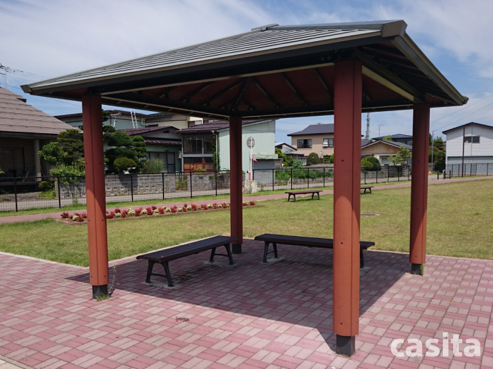 東屋があります。日除け対策にもなりますのでママ達もゆっくりと子供の遊びを見守れます。